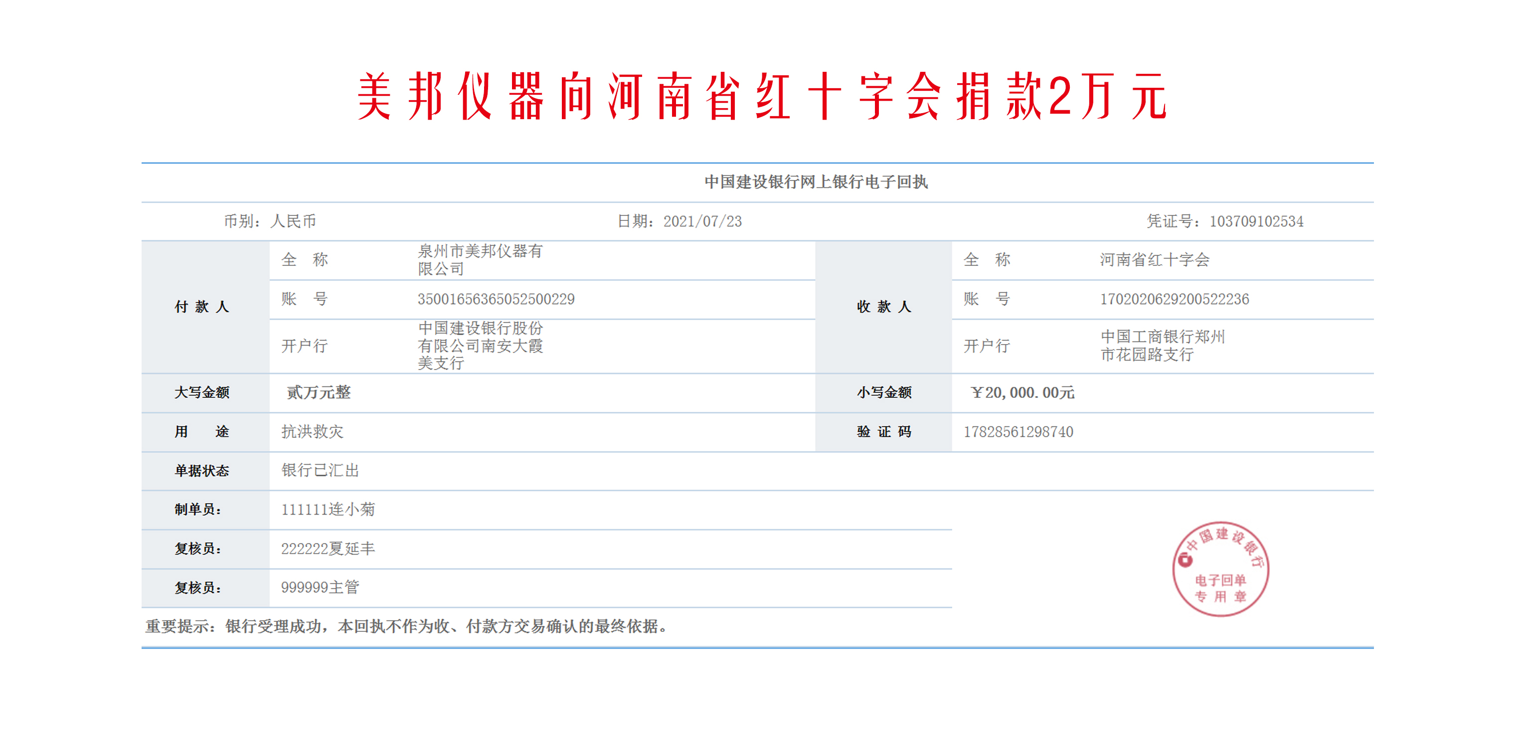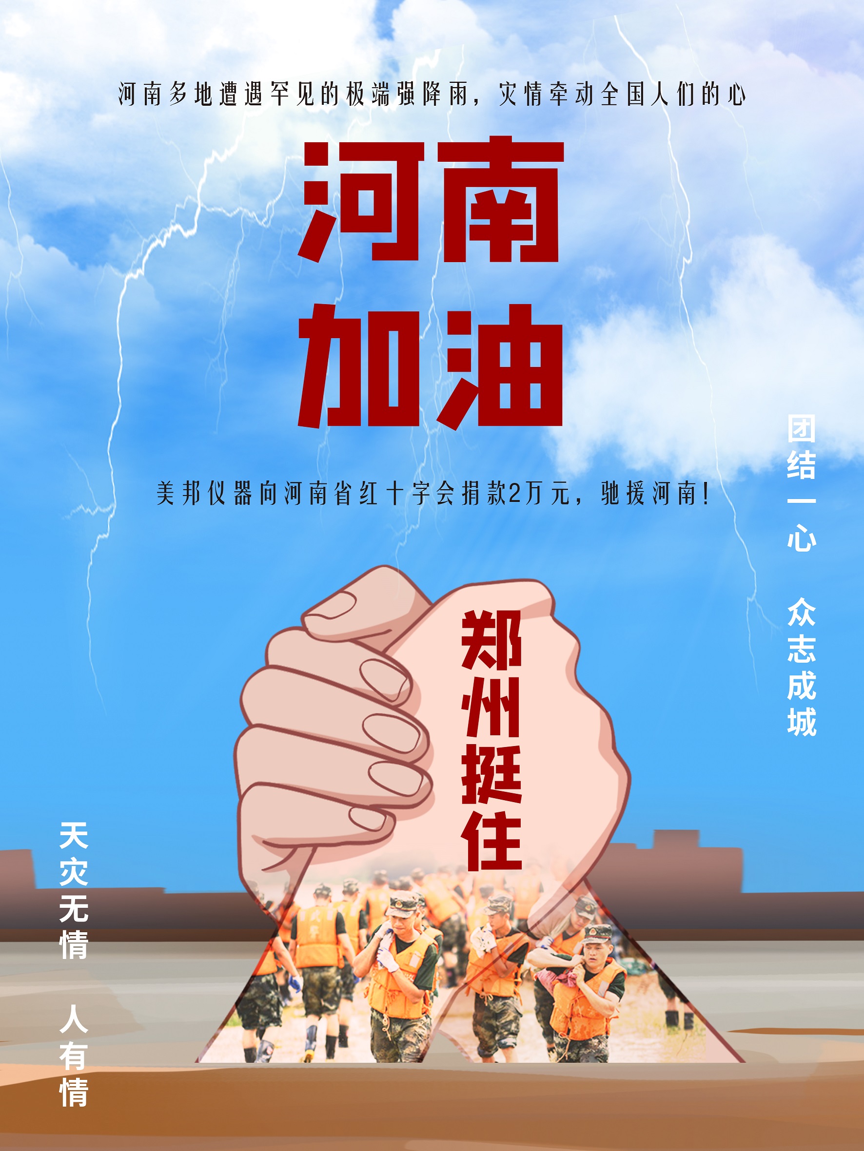 美邦儀器全體員工向奮斗在第一線的救災(zāi)人員致以崇高的敬意,同時我司向河南省紅十字會捐款2萬元,盡微薄之力!